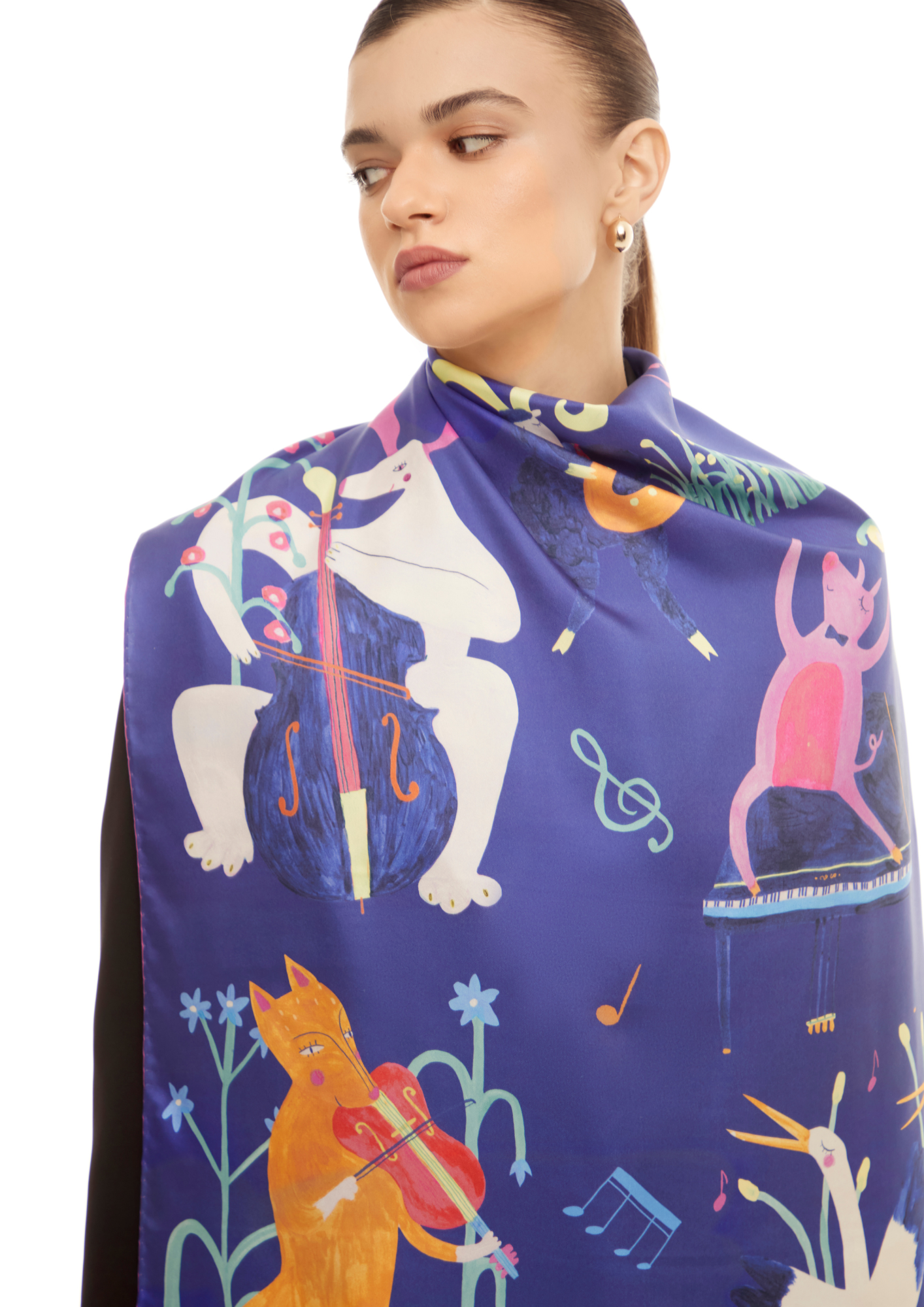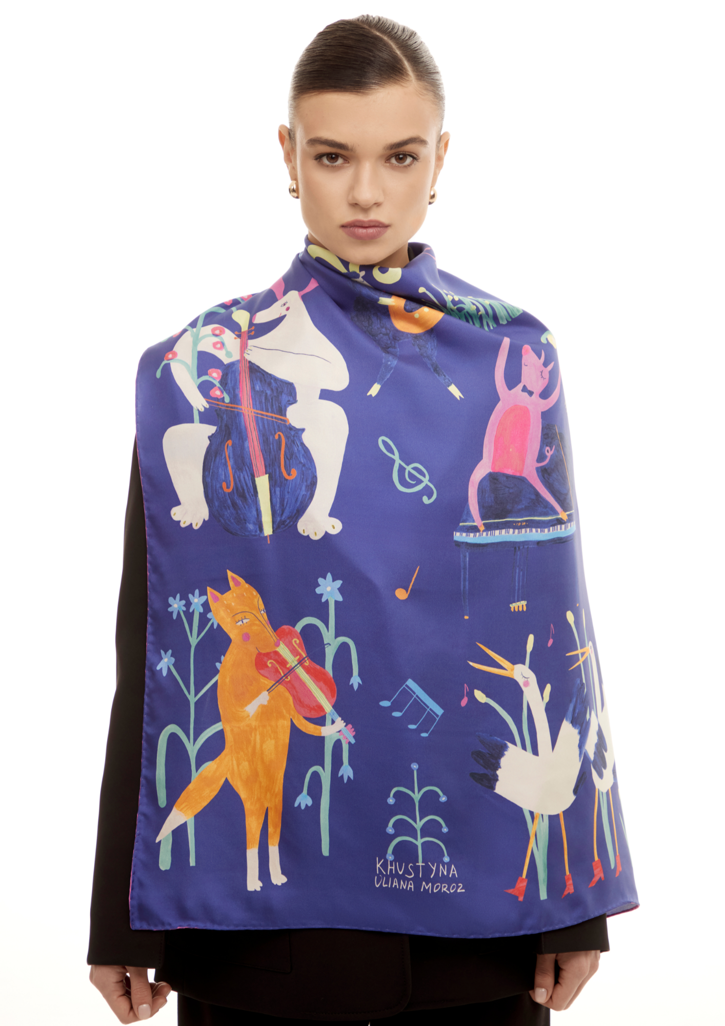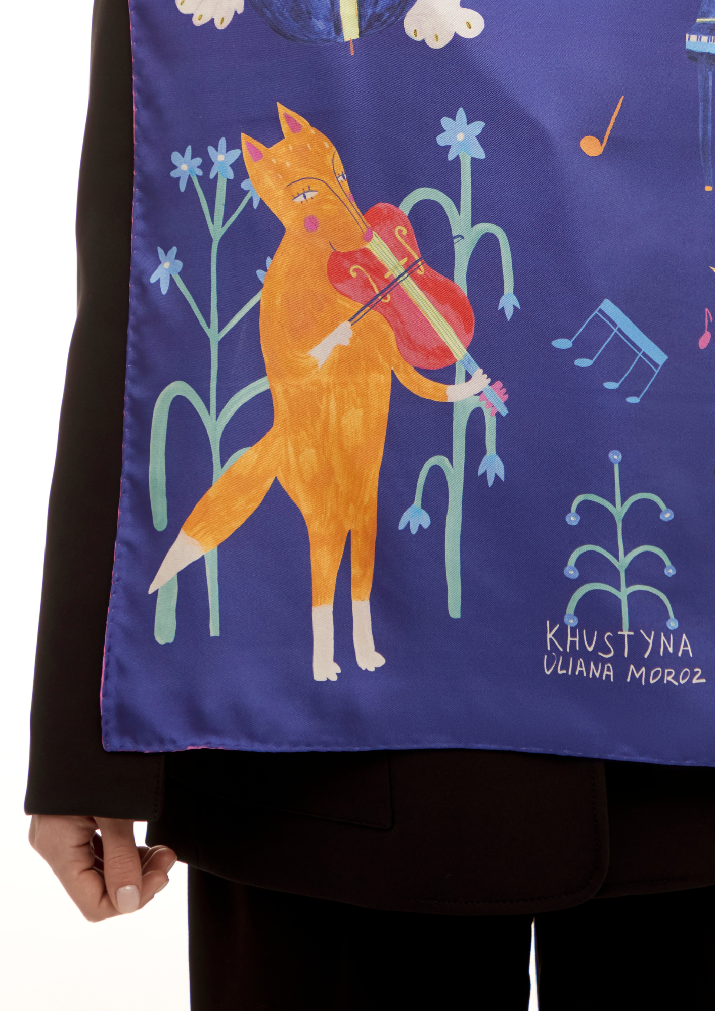 Я створила цю хустку у наївному стилі, де тварини грають на музичних інструментах. Усі персонажі намальовані вручну акриловими фарбами.