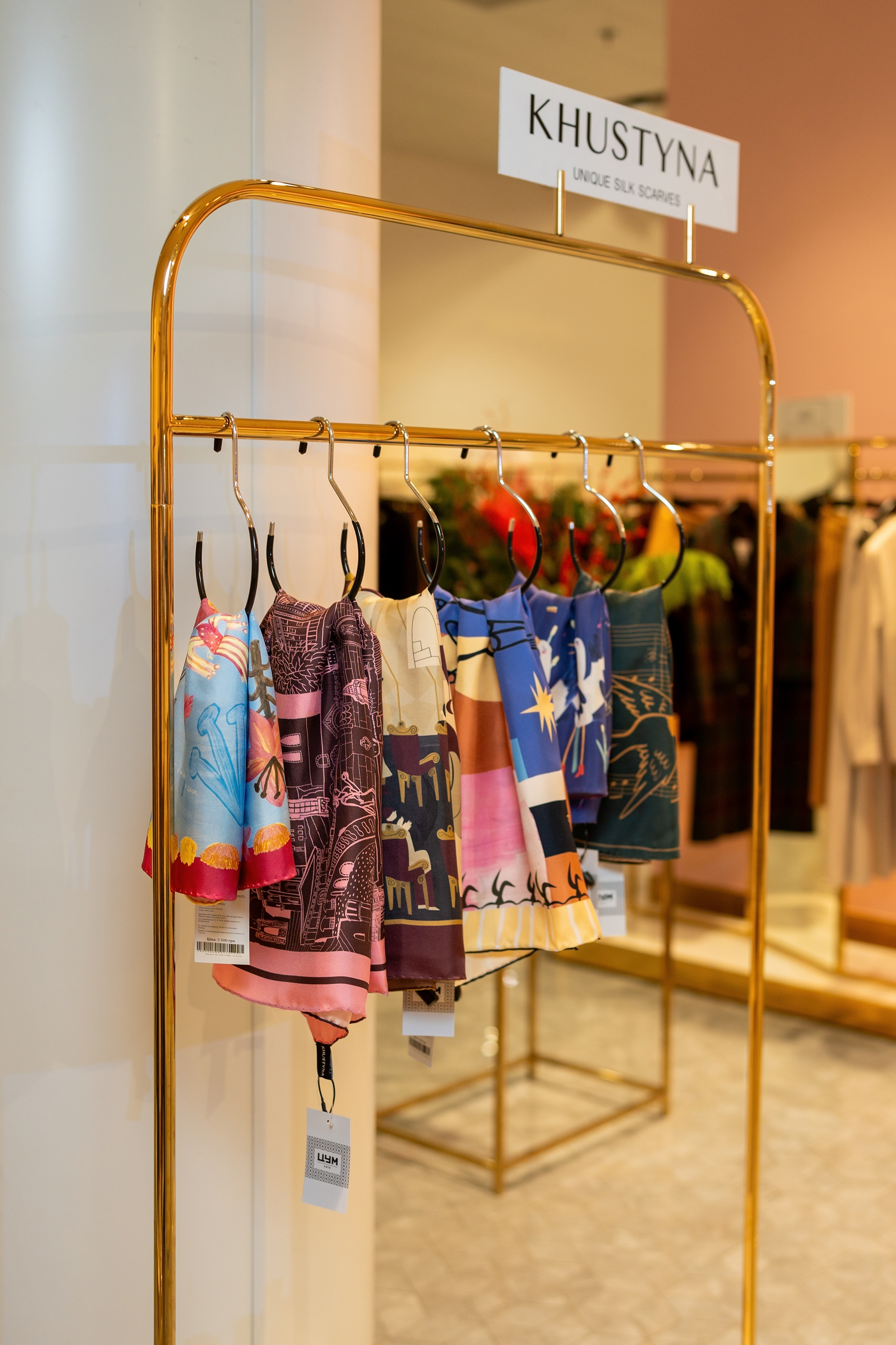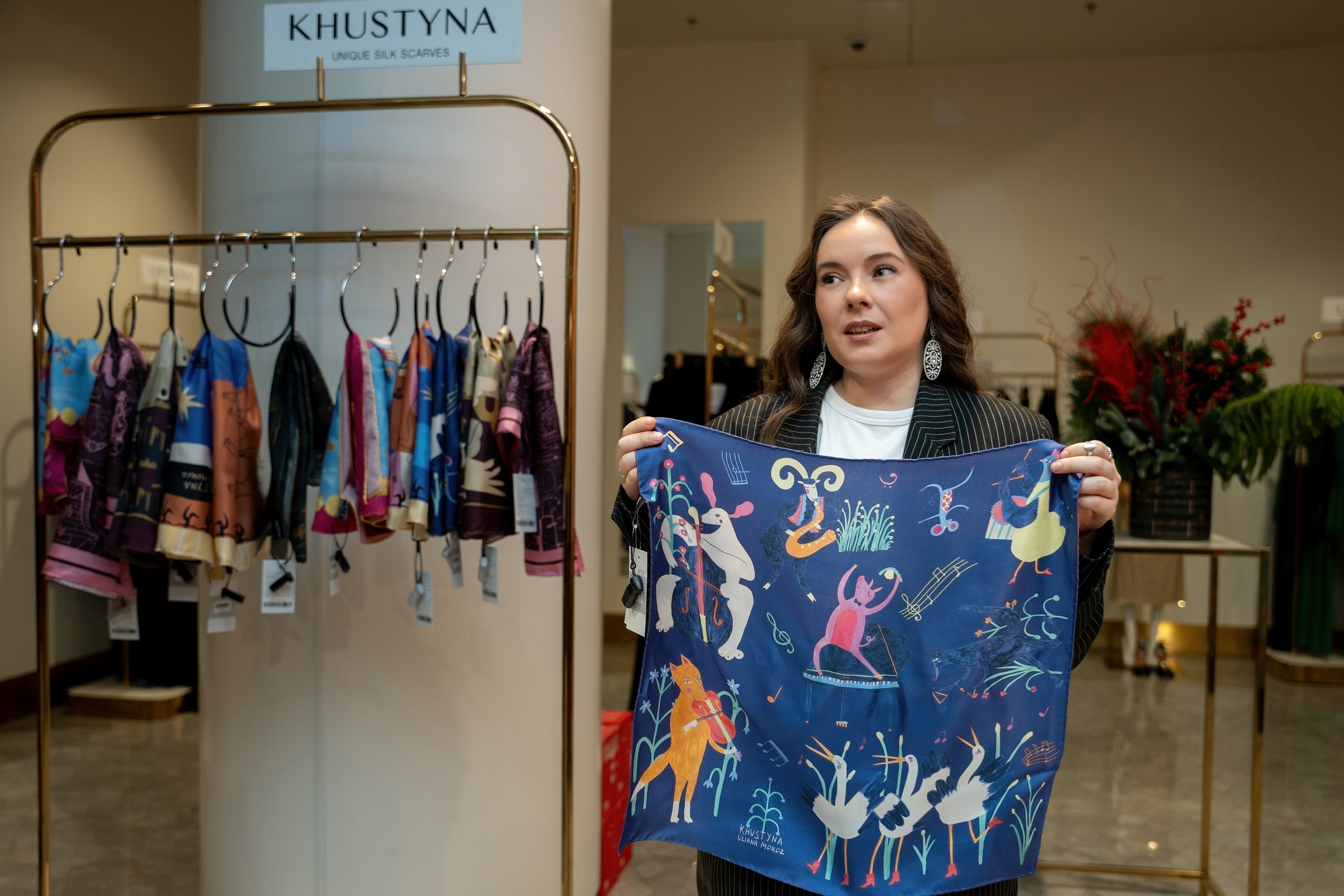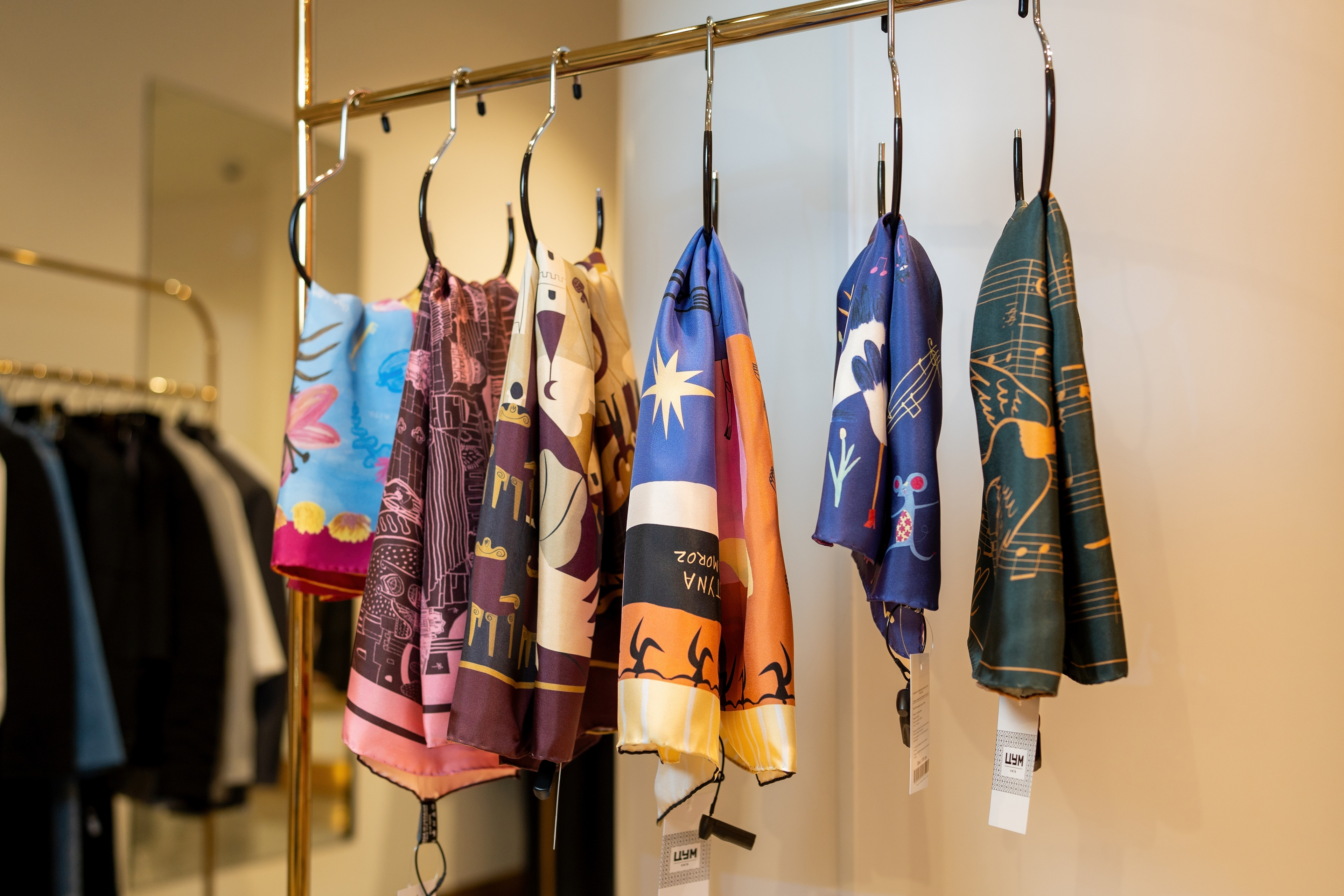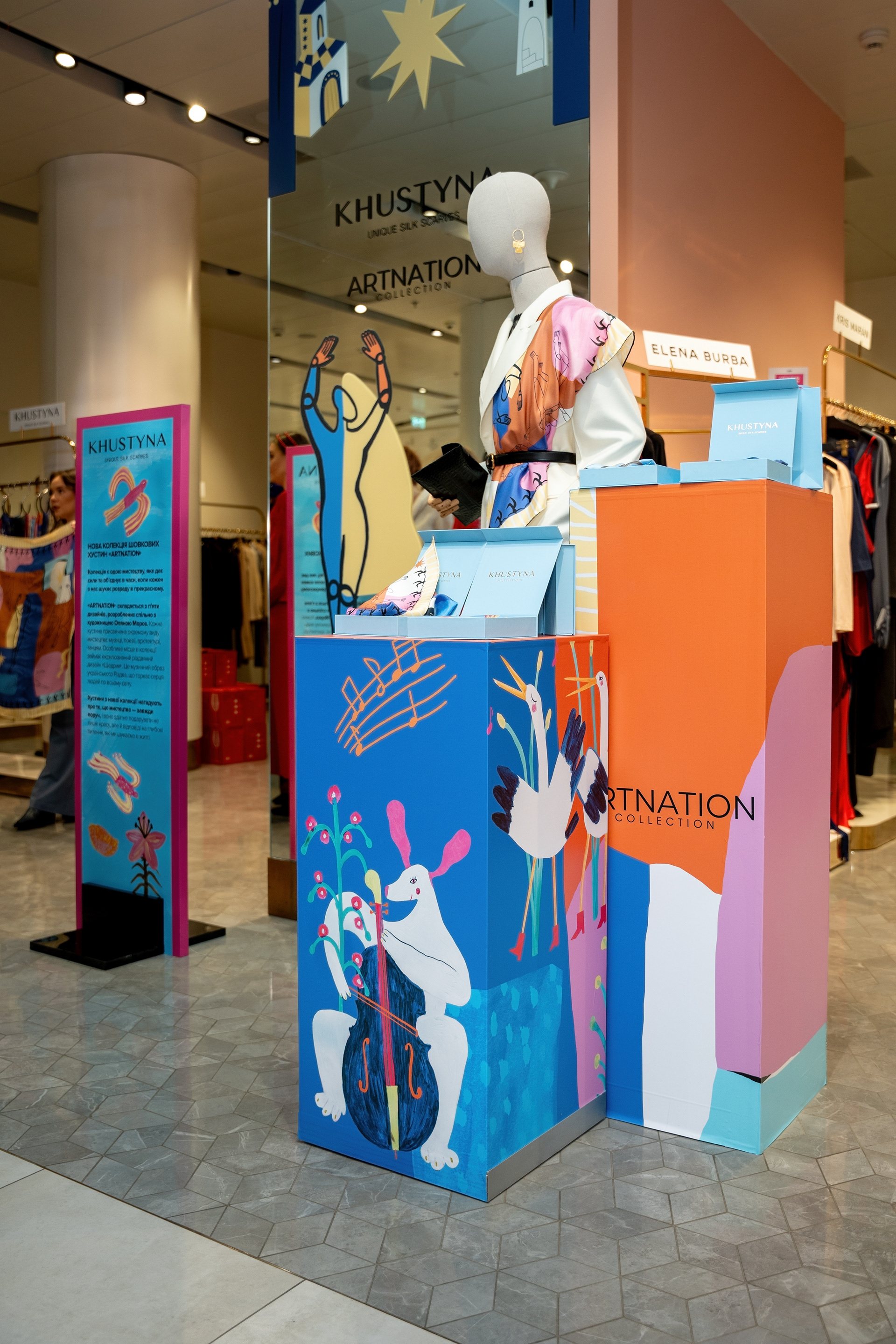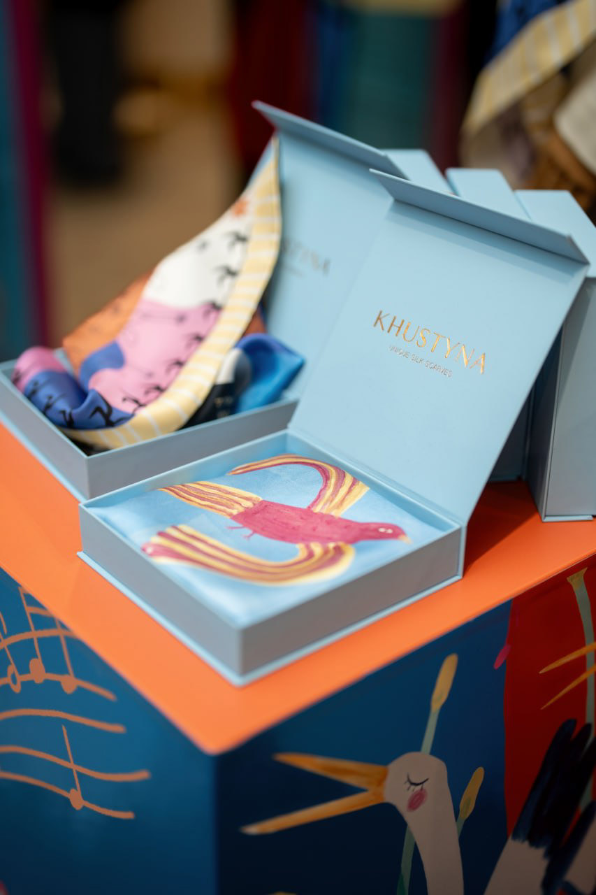 У цій колаборації я створила серію ілюстрацій для колекції хусток, натхненну багатогранністю українського мистецтва. Було чотири дизайни: танець, музика, архітектура, театр і поезія. Кожен мав свій унікальний стиль, кольорову палітру та історію. Створені як символи живої культури, ці хустки стали частиною сучасної артсцени й були представлені у ЦУМ Київ.