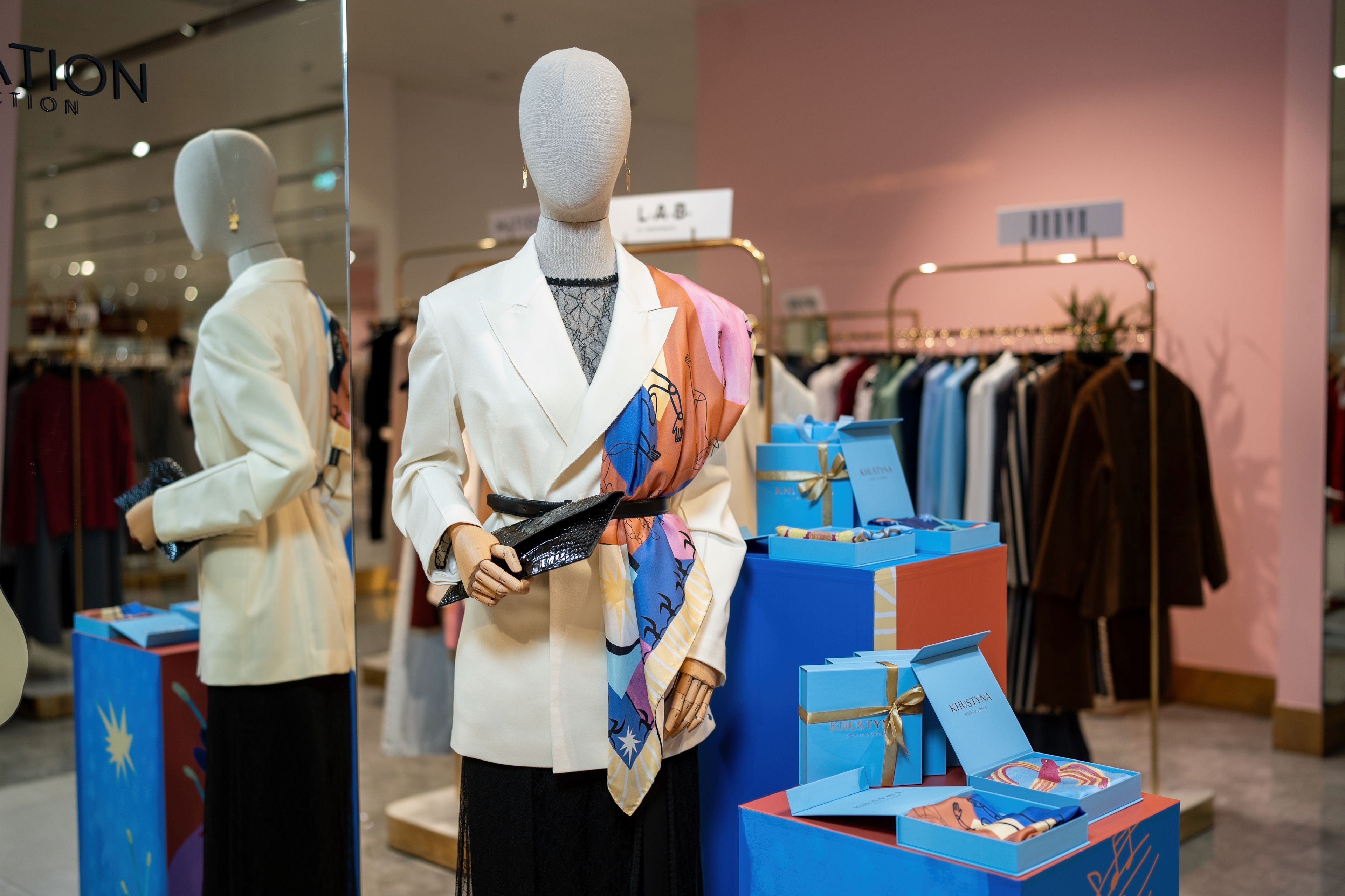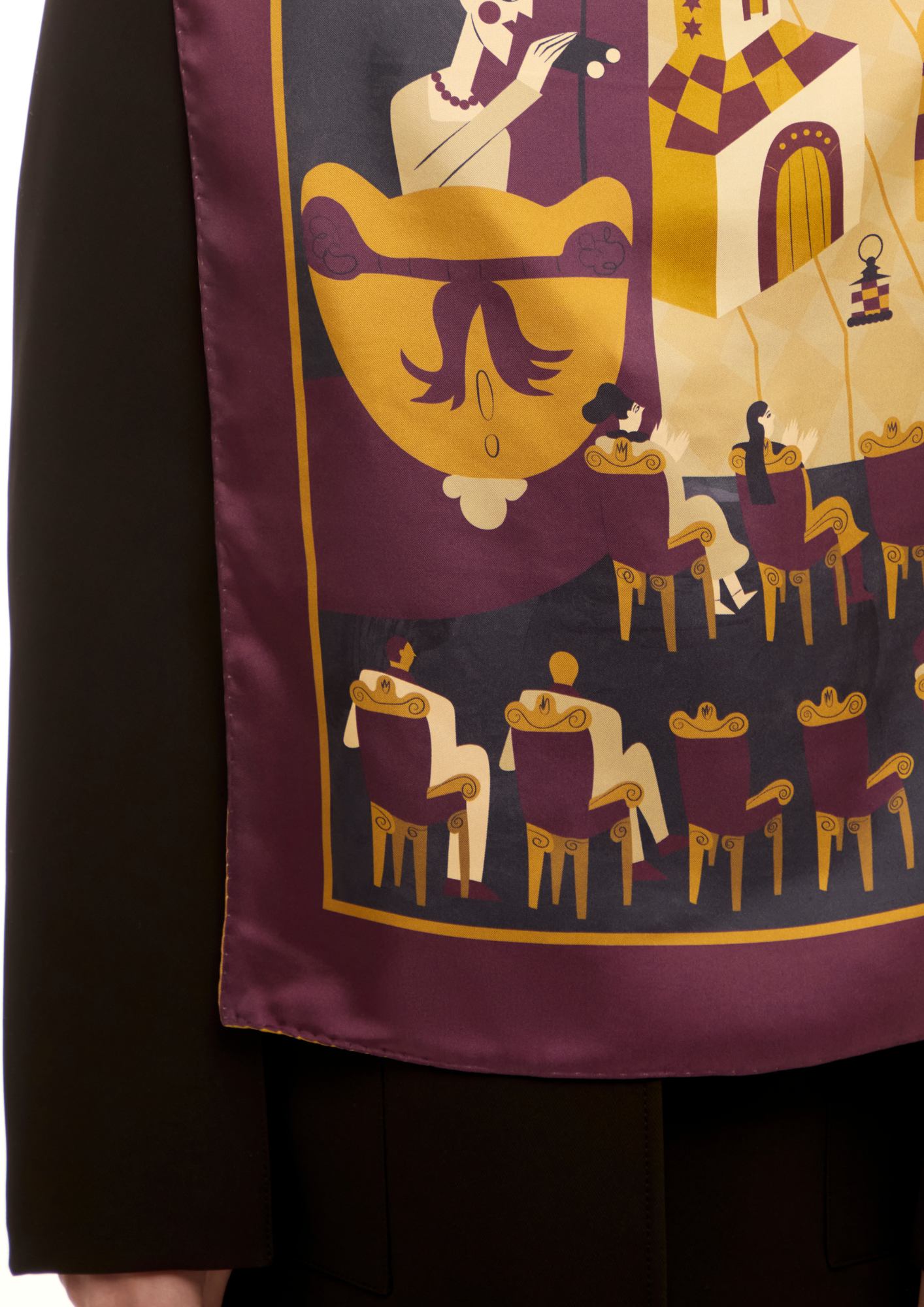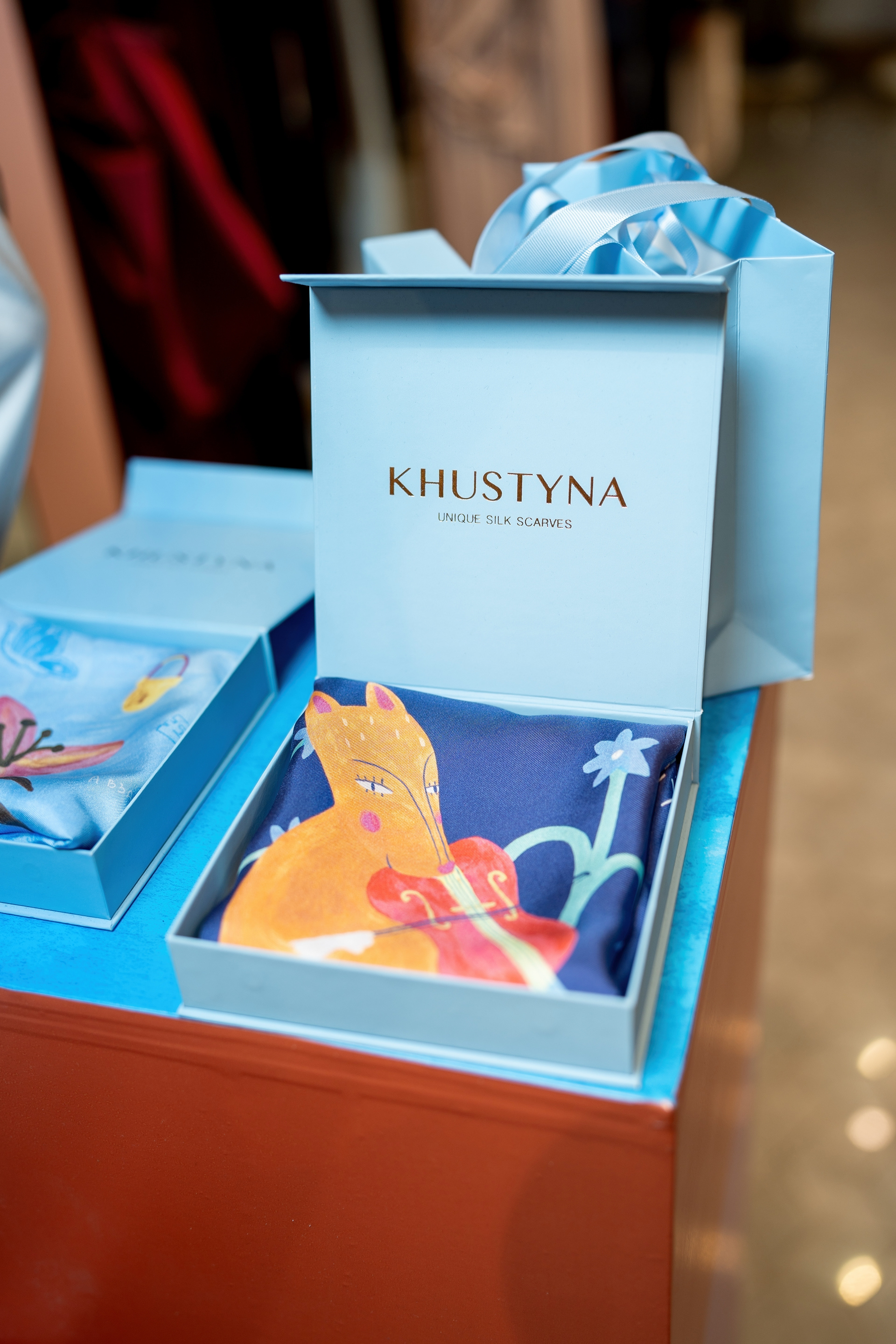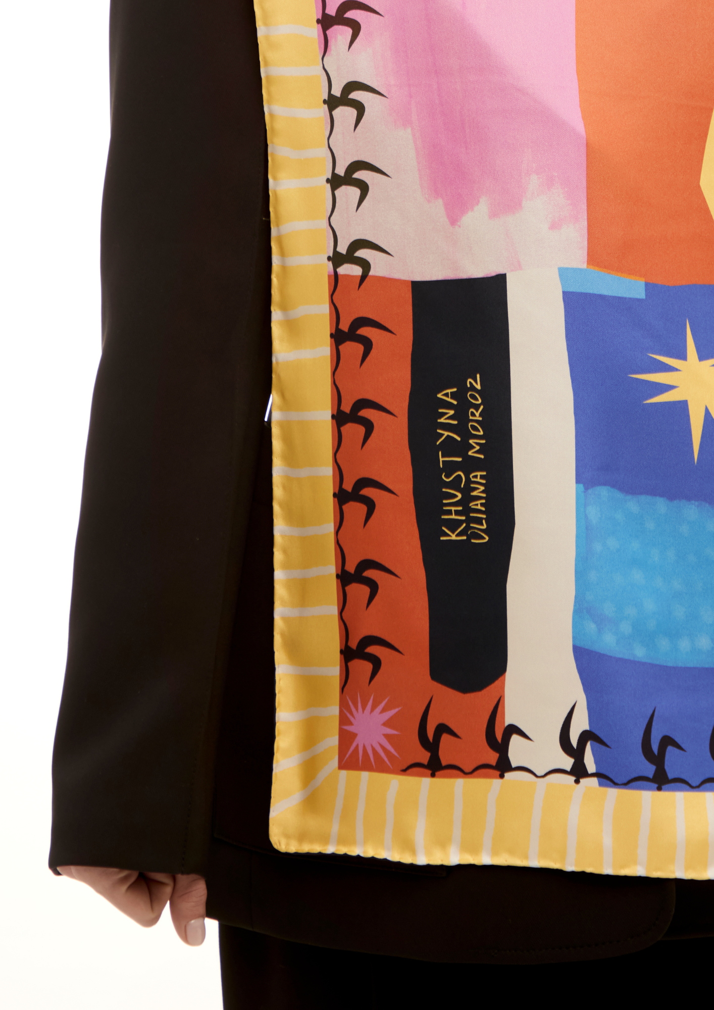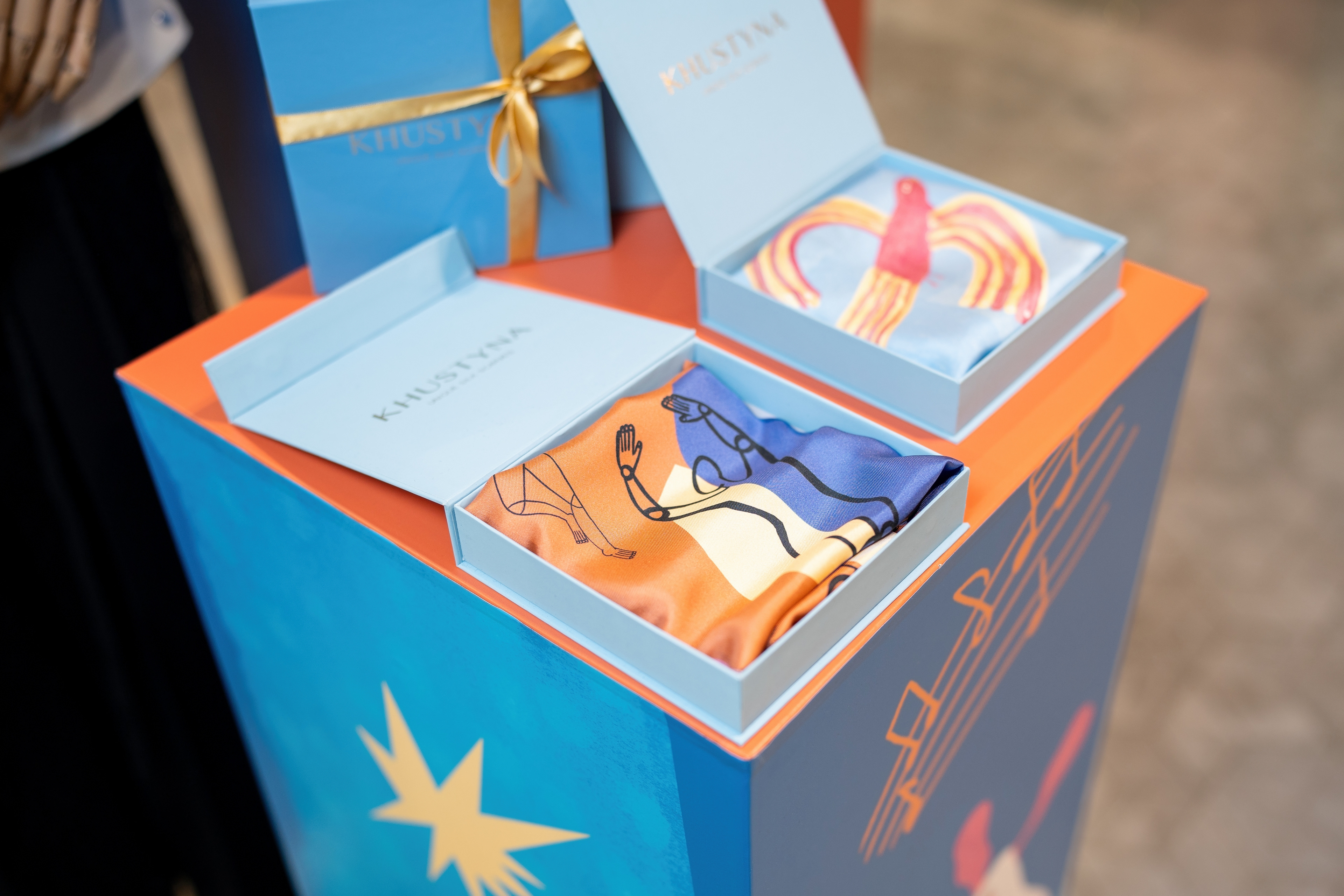 У цій колаборації я створила серію ілюстрацій для колекції хусток, натхненну багатогранністю українського мистецтва. Було чотири дизайни: танець, музика, архітектура, театр і поезія. Кожен мав свій унікальний стиль, кольорову палітру та історію. Створені як символи живої культури, ці хустки стали частиною сучасної артсцени й були представлені у ЦУМ Київ.