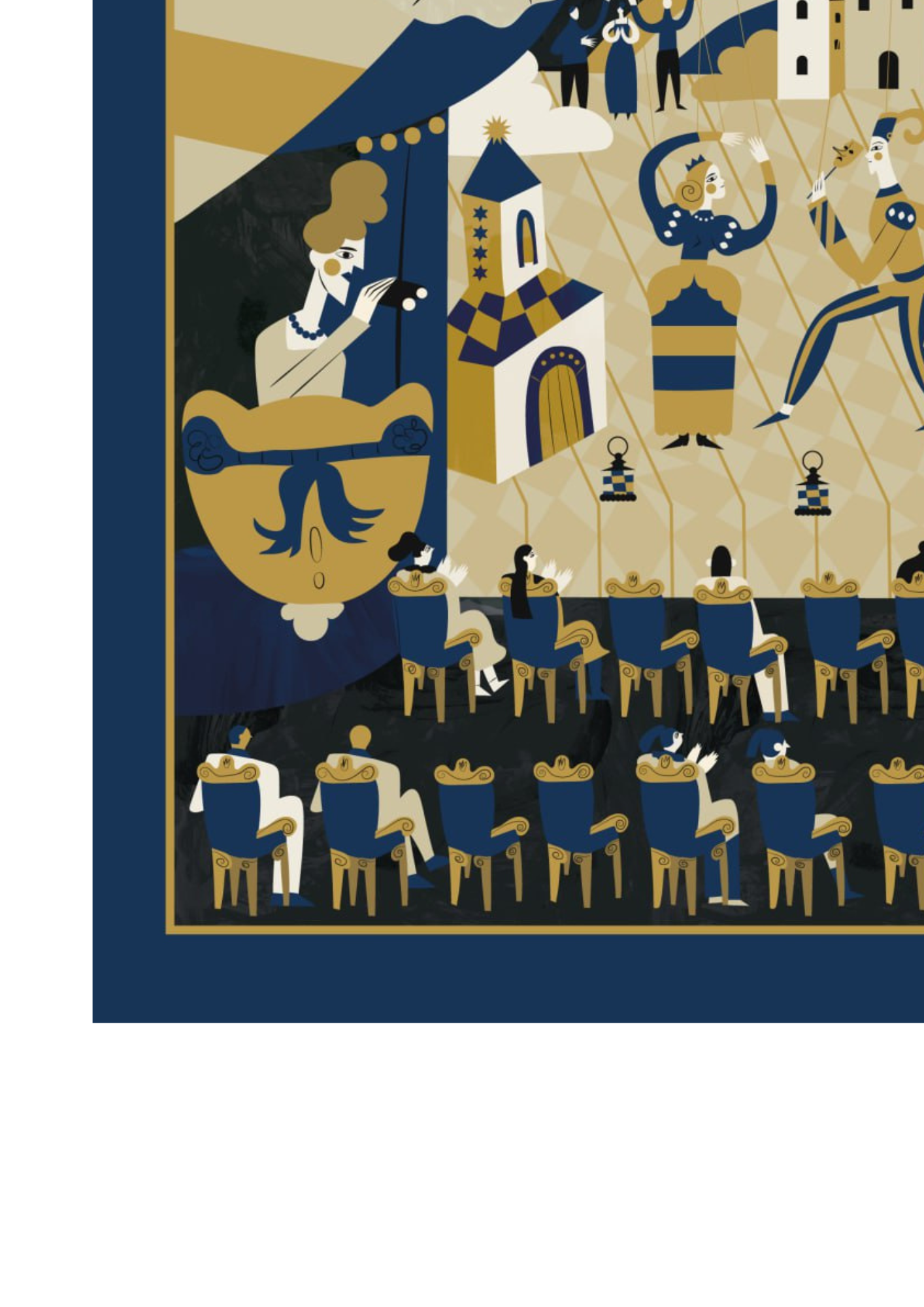 У центрі композиції — сцена, де розгортається вистава. Це символ творчості, гри та життя, яке постійно змінює ролі.