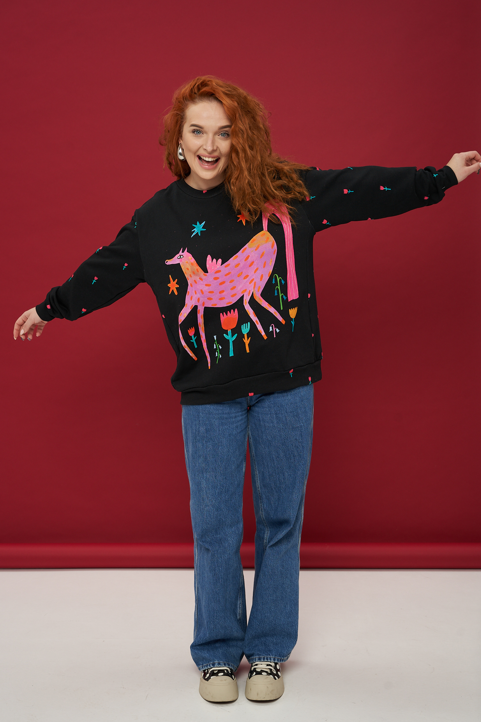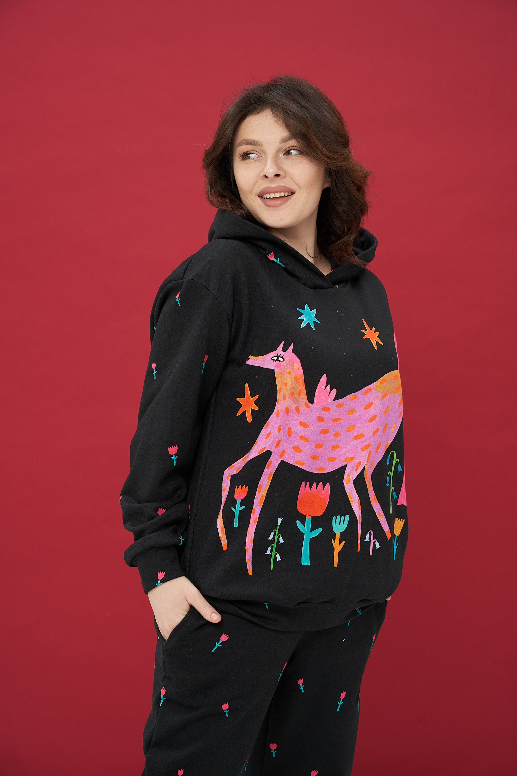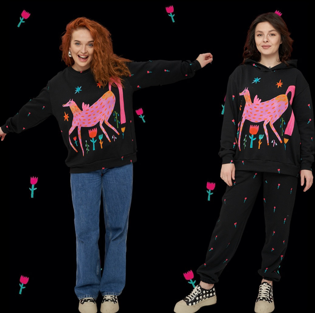 Ця візуальна історія розповідає про міфічного коня та кмітливу лисицю. Їхні образи ожили на різних предметах одягу — пуховиках, сукнях, худі та комплектам. Кожна ілюстрація була створена, щоб додати виробам грайливості, магії та наївності, перетворюючи повсякденний одяг на маленькі носимі історії.