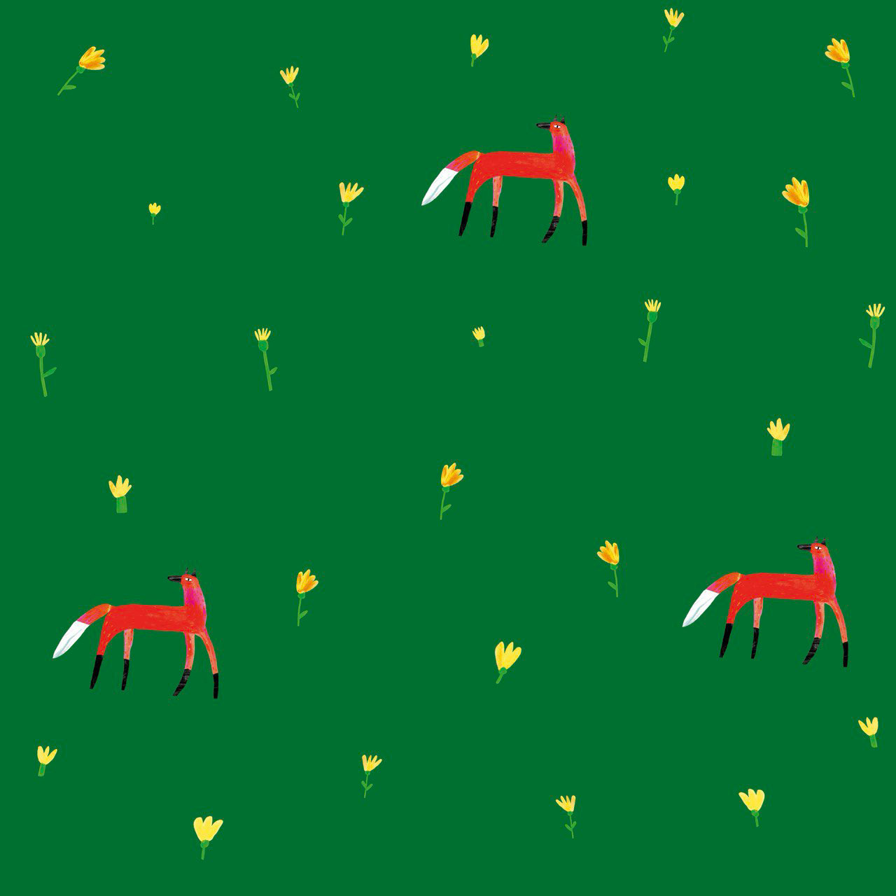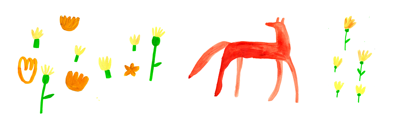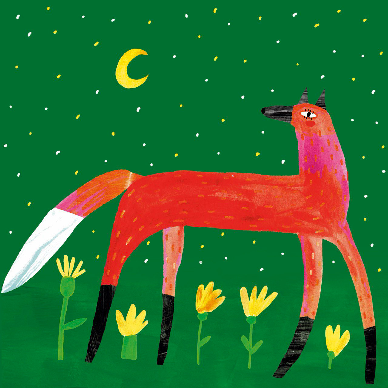 Лисиця з’являється на соковитому зеленому тлі, серед осінніх квітів. Її силует прикрашений текстурами, які додають образу тепла й чарівності