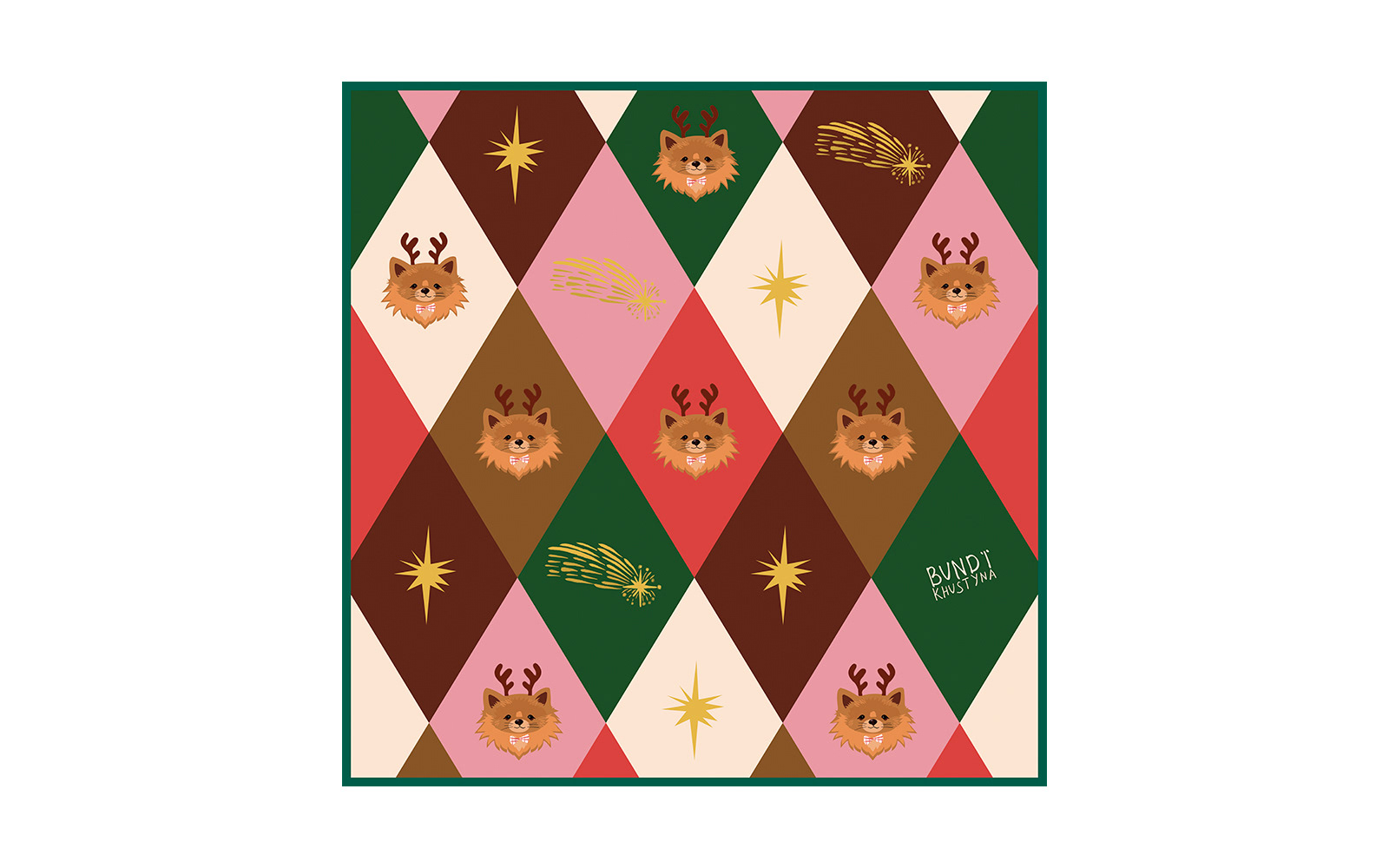 A cheerful pomeranian takes center stage in this playful holiday pattern.
