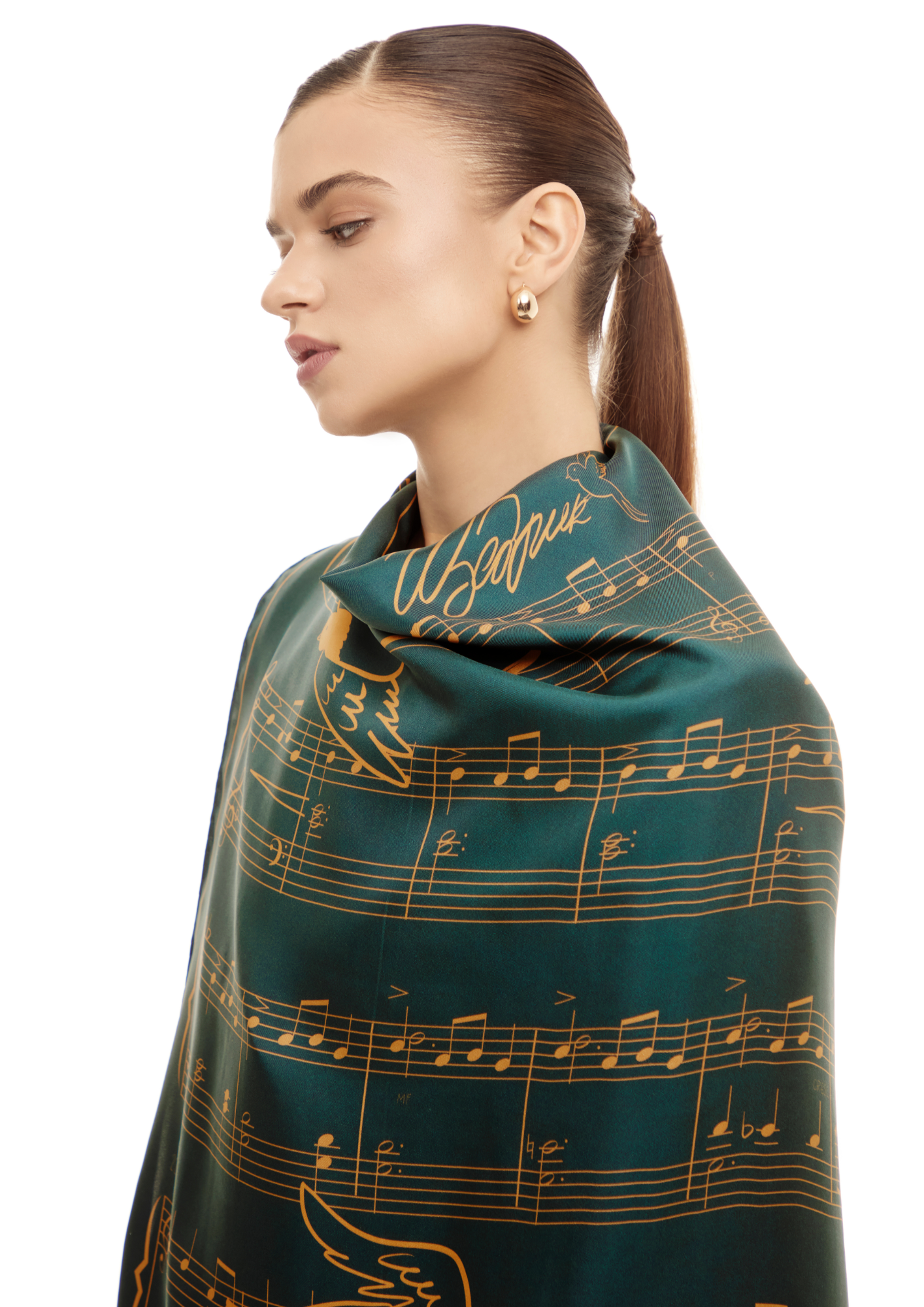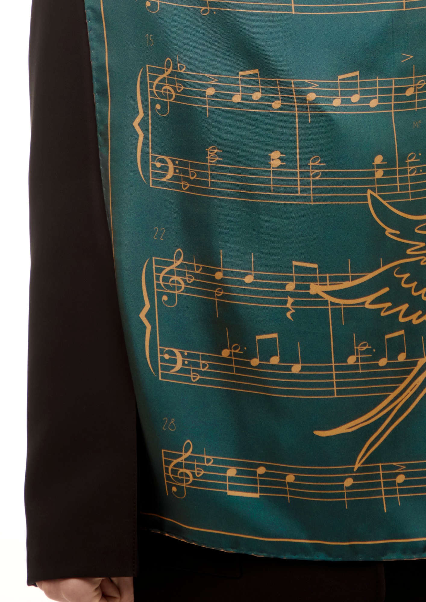 The iconic musical lines of Mykola Leontovych’s Shchedryk run through the scarf, accompanied by graceful swallows — symbols of hope and renewal.