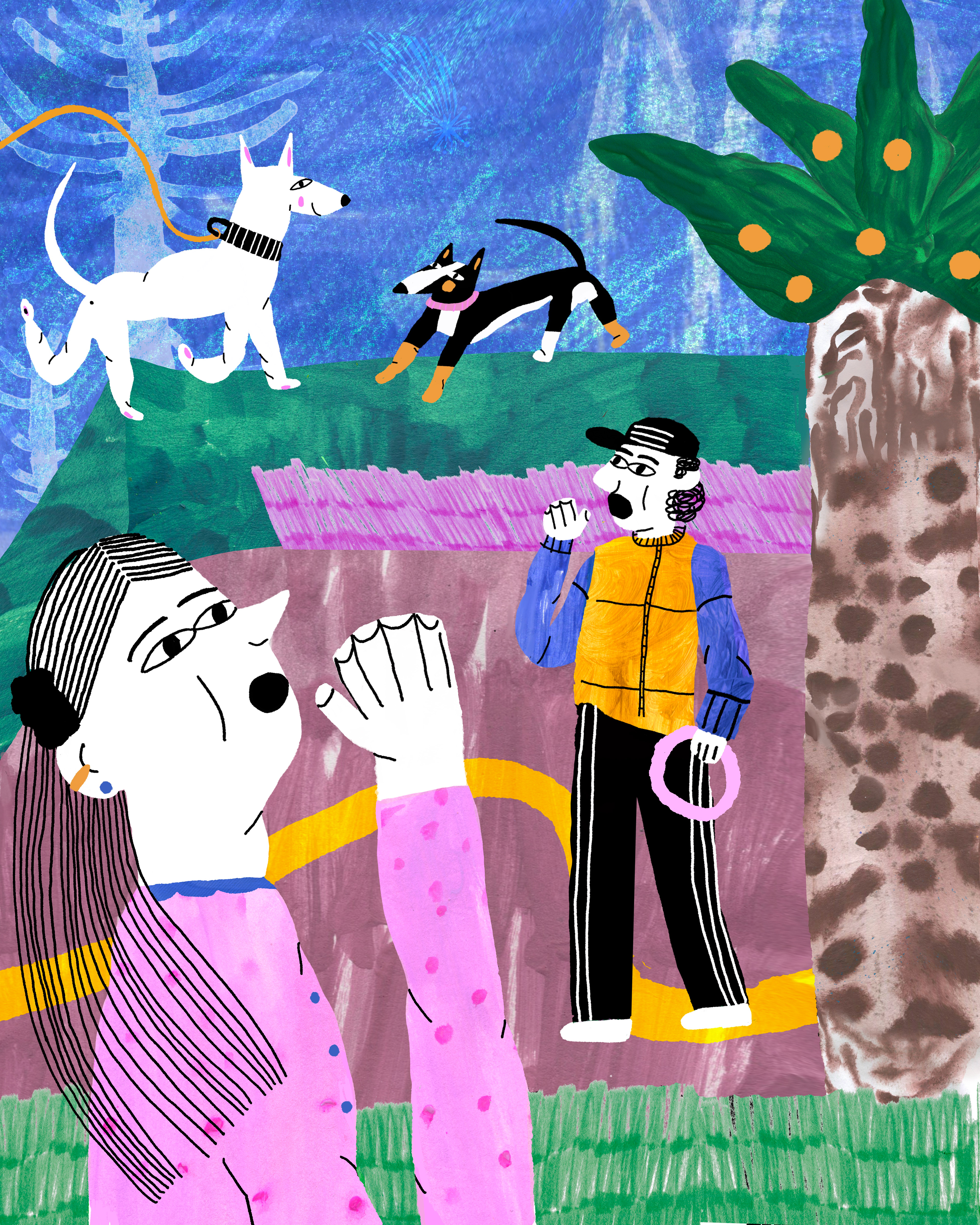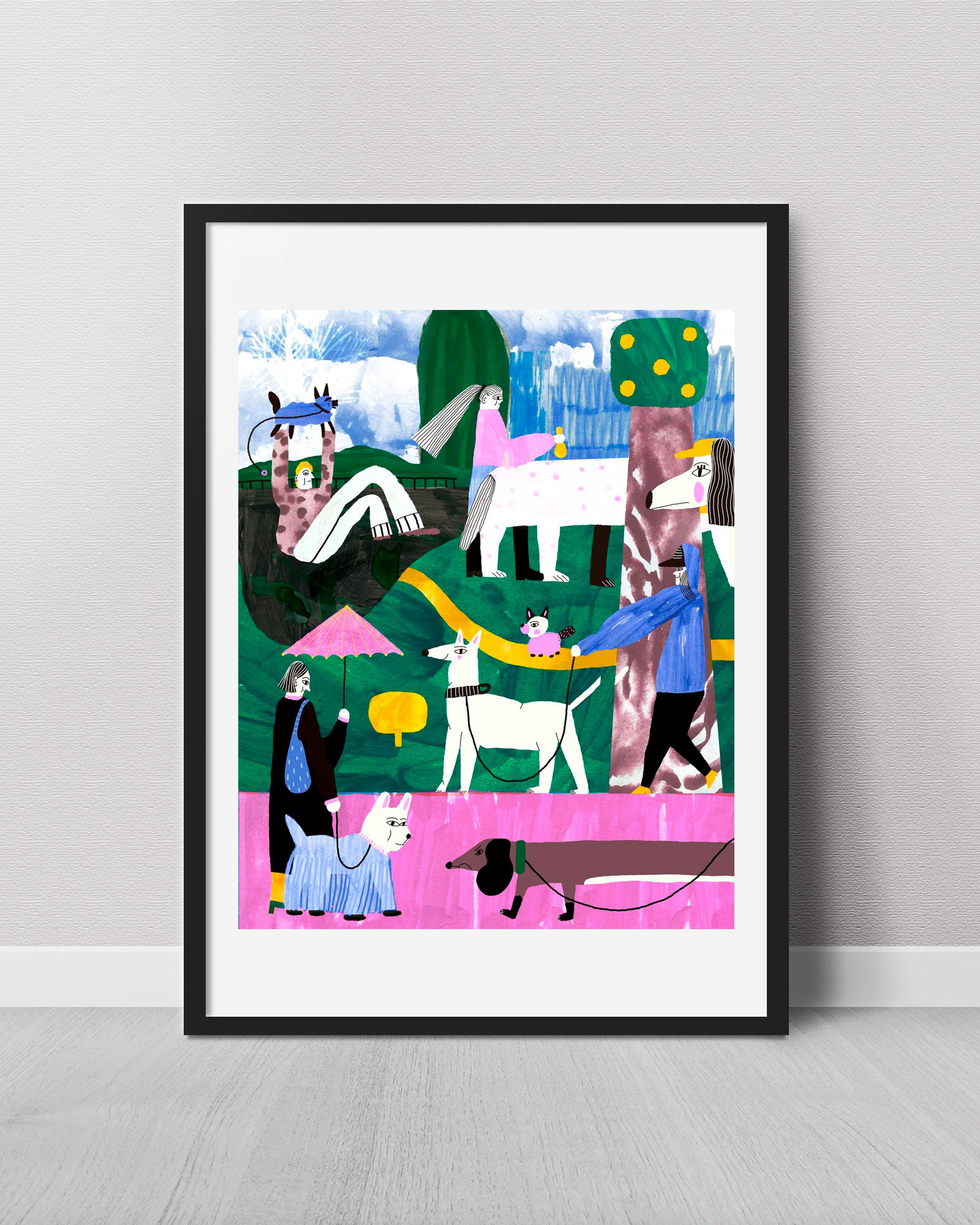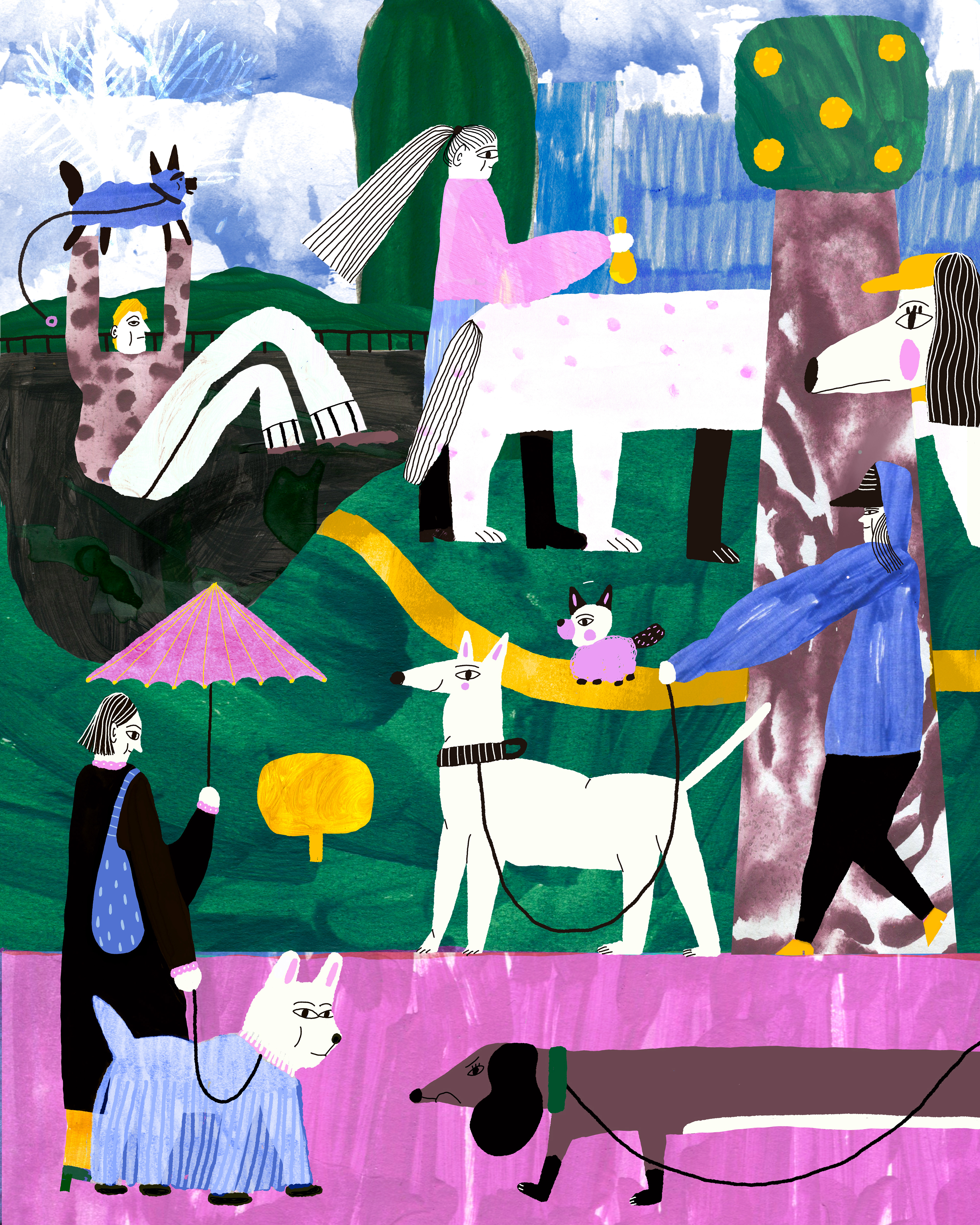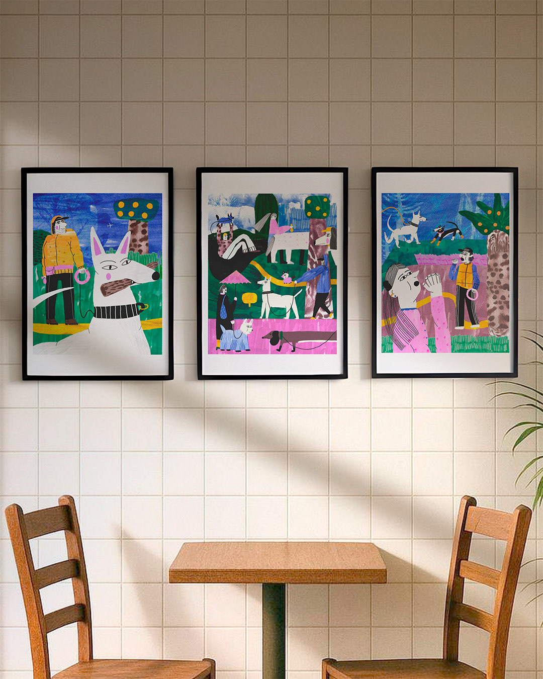 Серія, яку я створила після появи мого пса. Разом з ним для мене відкрилося зовсім інше місто — парк як сцена, собаки й люди як співмешканці простору. Я працюю з міксом живих текстур і цифрового колажу, досліджуючи колір, ритм і маленькі соціальні ландшафти.